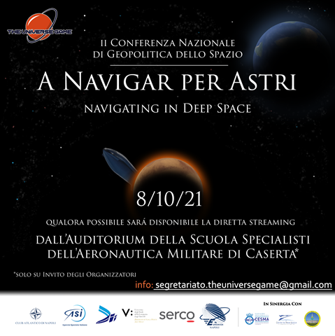 L’8 Ottobre 2021, si svolgerà qualora possibile, in diretta streaming, per i non invitati, presso l’Auditorium della Scuola Specialisti dell'Aeronautica Militare di Caserta, la II Conferenza Nazionale di Geopolitica dello Spazio “a Navigar per Astri - Navigating in Deep Space”. Questo evento è testimone dello sviluppo tecnologico e industriale dei soggetti pubblici e delle aziende Aerospaziali di tutto il mondo, mirato alla scoperta dello spazio e in un futuro, che si auspica vicino, alla colonizzazione dei mondi extraterrestri. Insieme ad un eccezionale team di Associazioni e Istituzioni abbiamo collaborato per mesi per organizzare nel modo migliore e completo possibile questo evento in modo tale da garantire un environment sereno e nel pieno rispetto delle normative Covid attualmente vigenti.